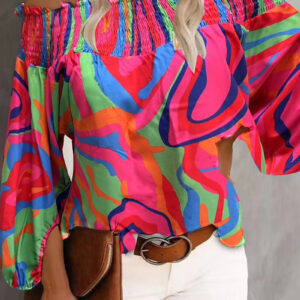 • Colour Casual Print Patchwork Off the Shoulder Tops