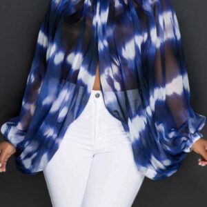 • Blue Casual Print Patchwork Slit Half A Turtleneck Tops
