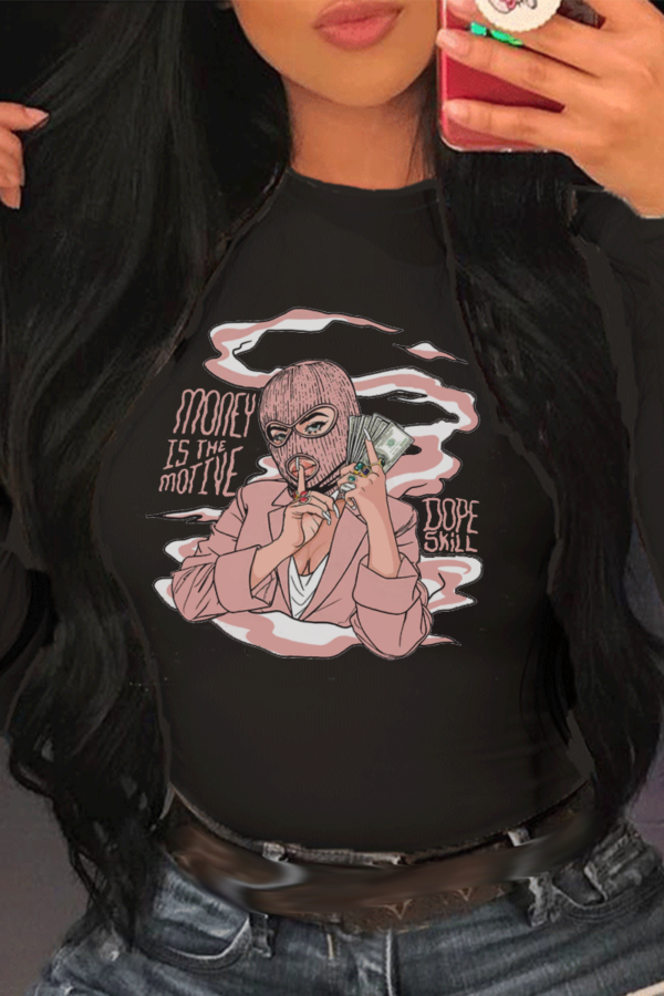 • Black Daily Vintage Print Patchwork O Neck Tops