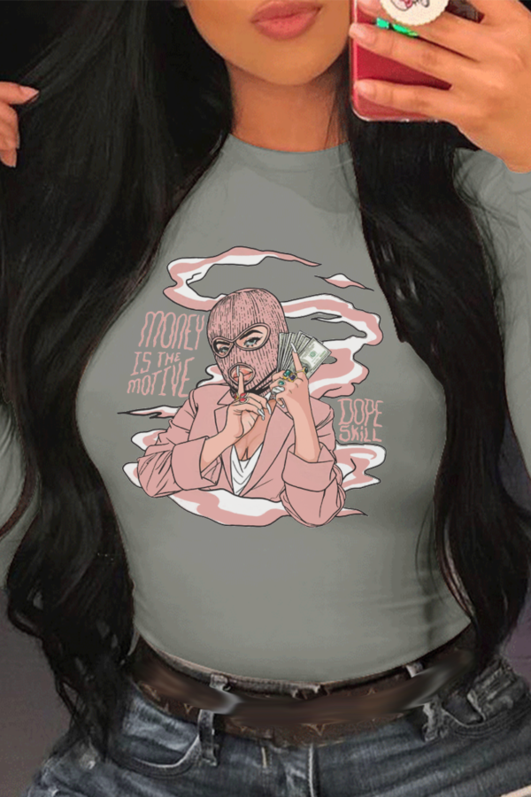 • Grey Casual Daily Print Patchwork O Neck Tops
