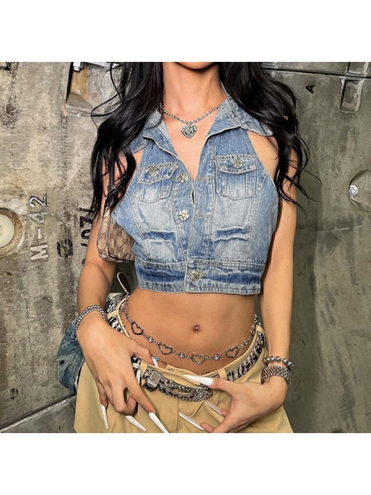 HomeTOPRetro Single Breasted Denim Halter Crop Vest