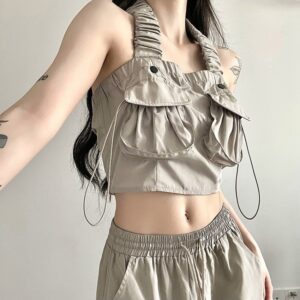• Designer Khaki Pockets Halter Cropped Tank Tops Women $40.00
